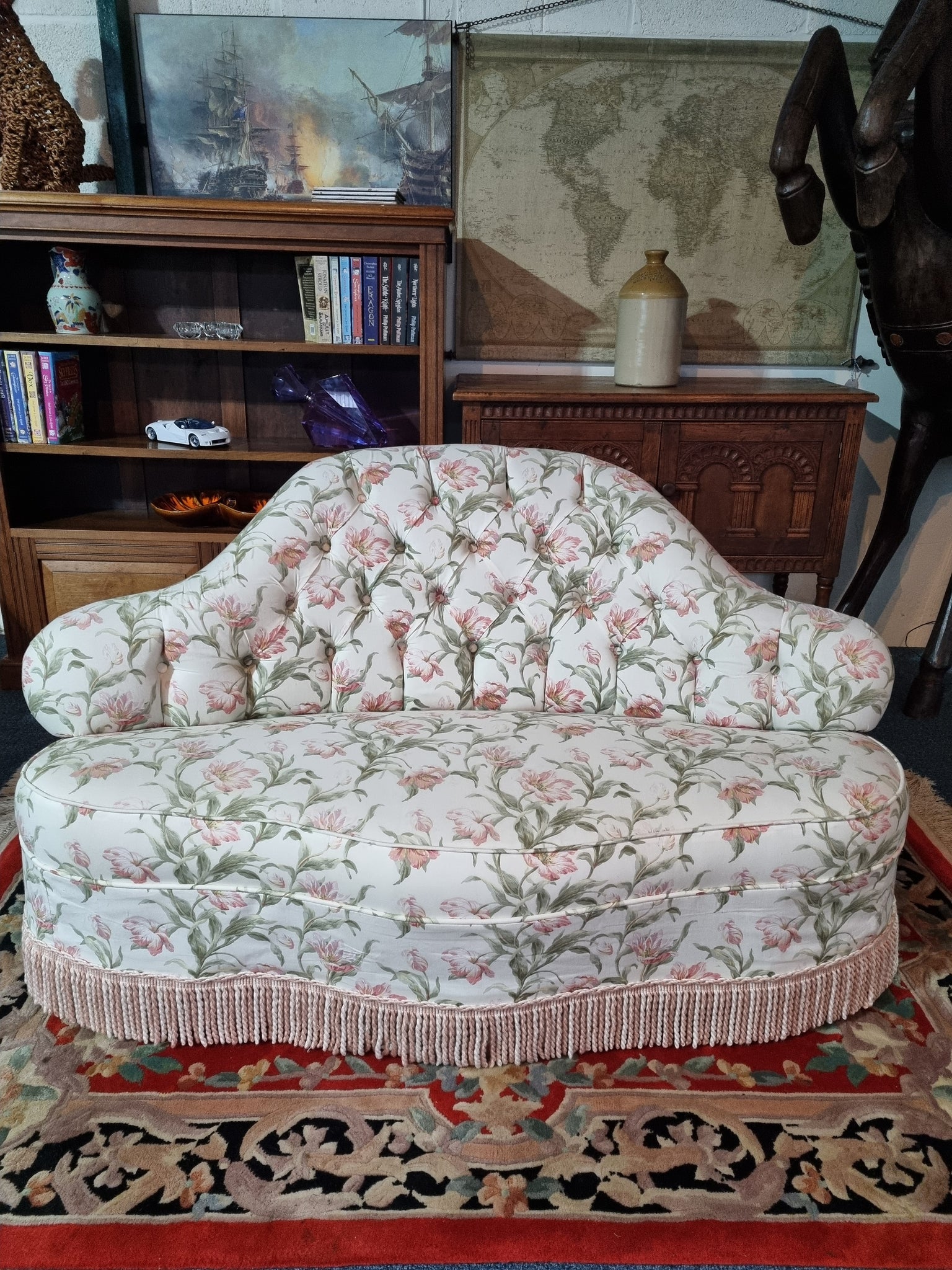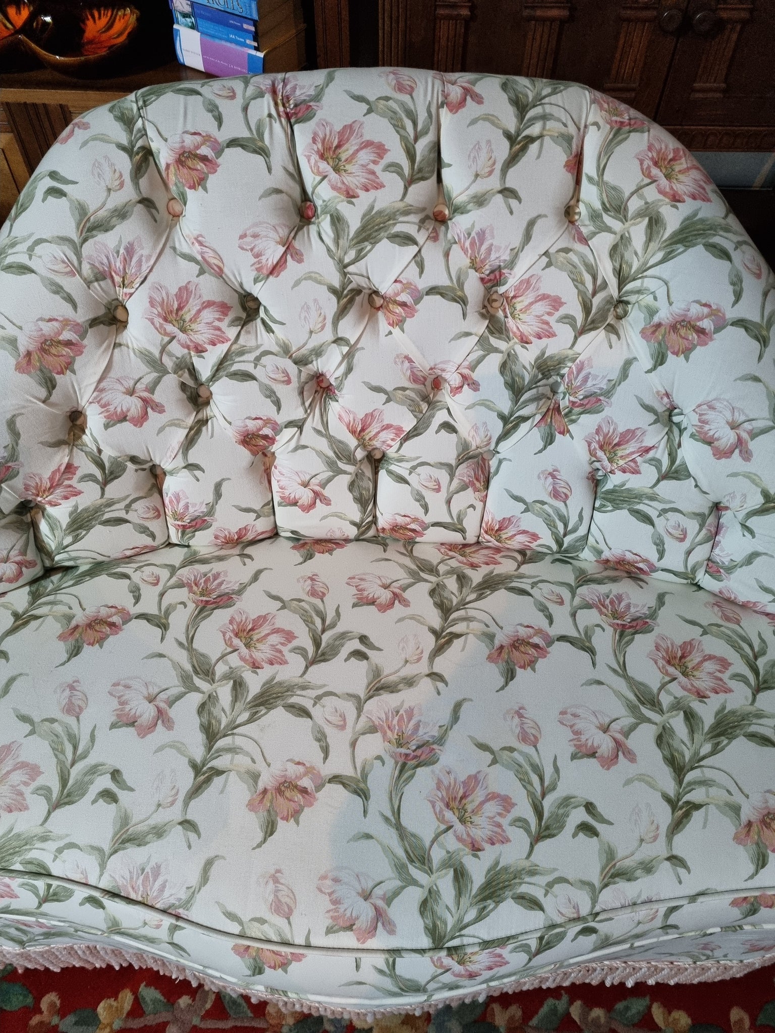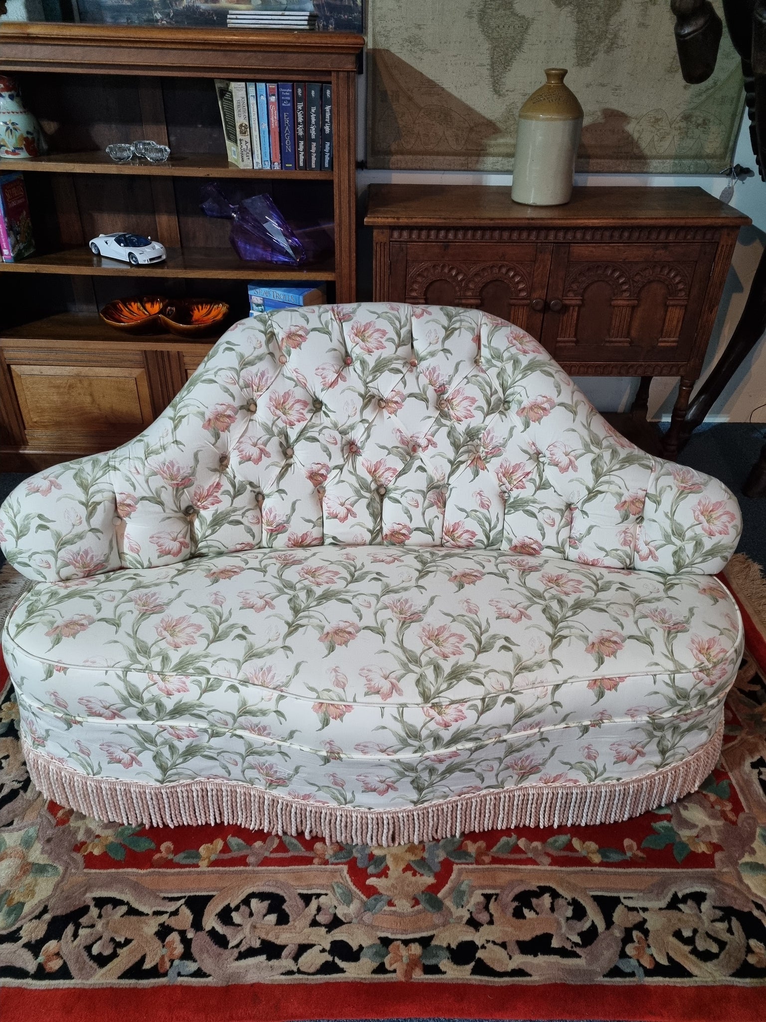 Victorian sofa upholstered in a floral button-back fabric
